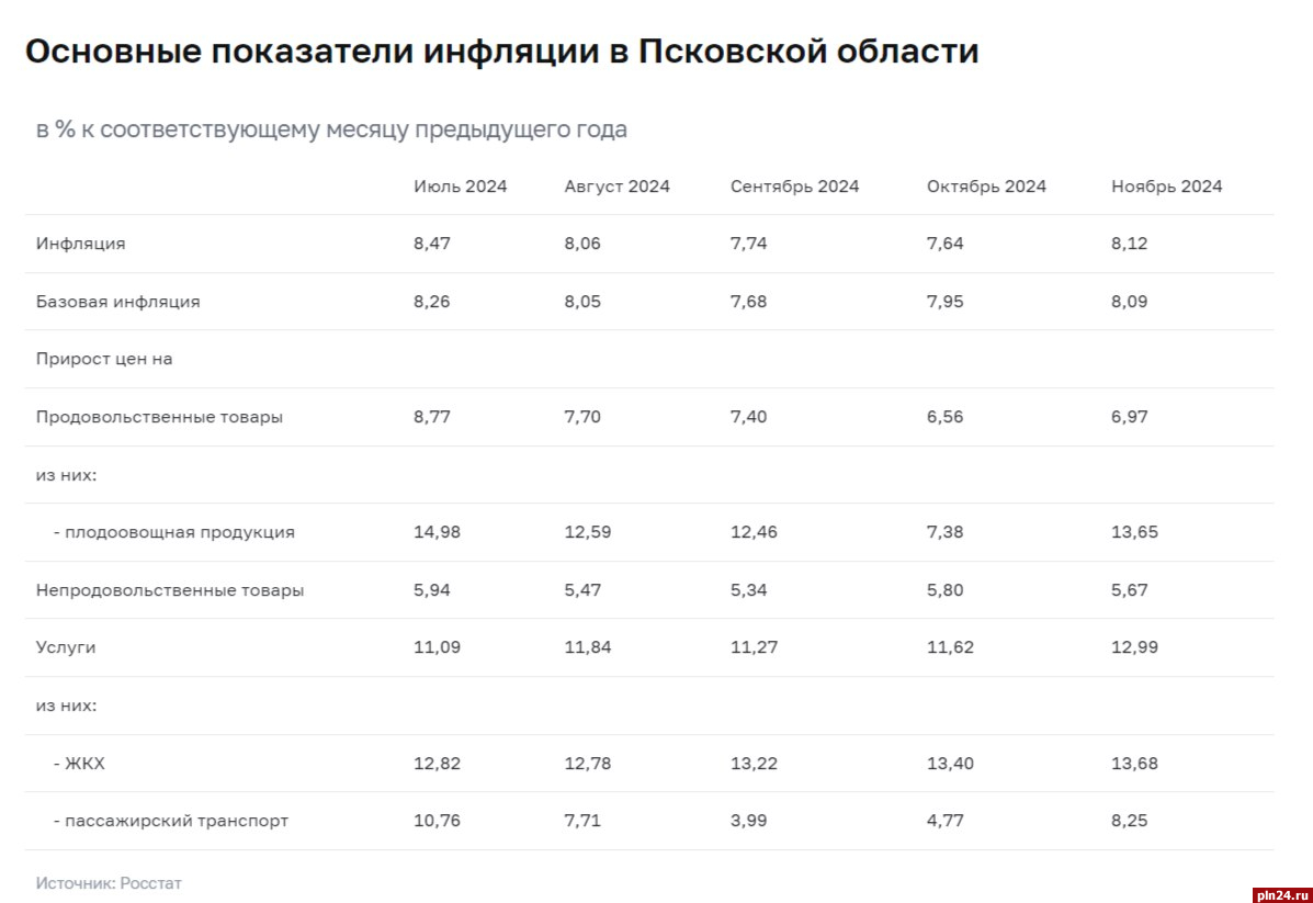 По данным Росстата, годовая инфляция в Псковской области в ноябре 2024 года увеличилась до 8,12% после 7,64% в октябре.