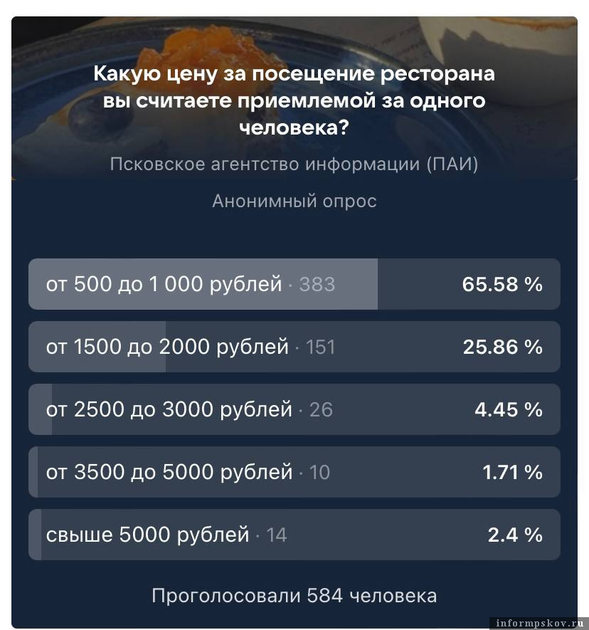 Большинство псковичей (65 %) готовы заплатить за поход в кафе или ресторан за одного человека от 500 до 1 000 рублей.