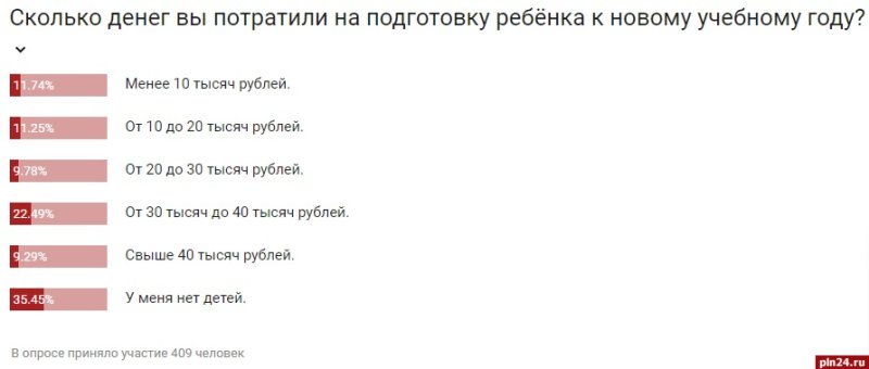 Большинство респондентов Псковской Ленты Новостей (22,49%) потратили на подготовку ребёнка к новому учебному году от 30 до 40 тысяч рублей. Это следует из опроса, в котором приняли участие 409 человек.