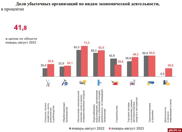 Доля убыточных организаций в Псковской области за январь-август 2023 года (без субъектов малого предпринимательства, кредитных организаций, государственных (муниципальных) учреждений, некредитных финансовых организаций) составила 41,8%. Об этом Псковской Ленте Новостей сообщили в Псковстате.