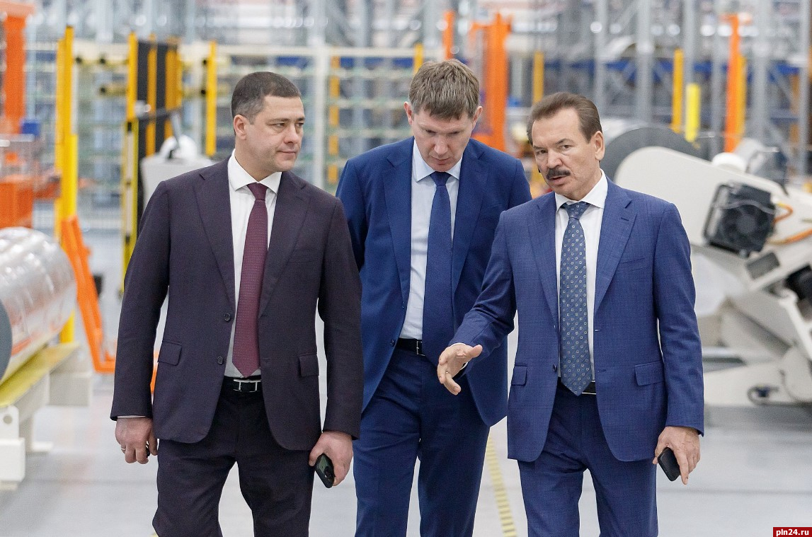 На территории предприятия министра и губернатора Псковской области Михаила Ведерникова встретили председатель совета директоров ГК «Титан» Михаил Сутягинский и генеральный директор завода «Титан-Полимер» Кирилл Неретин.