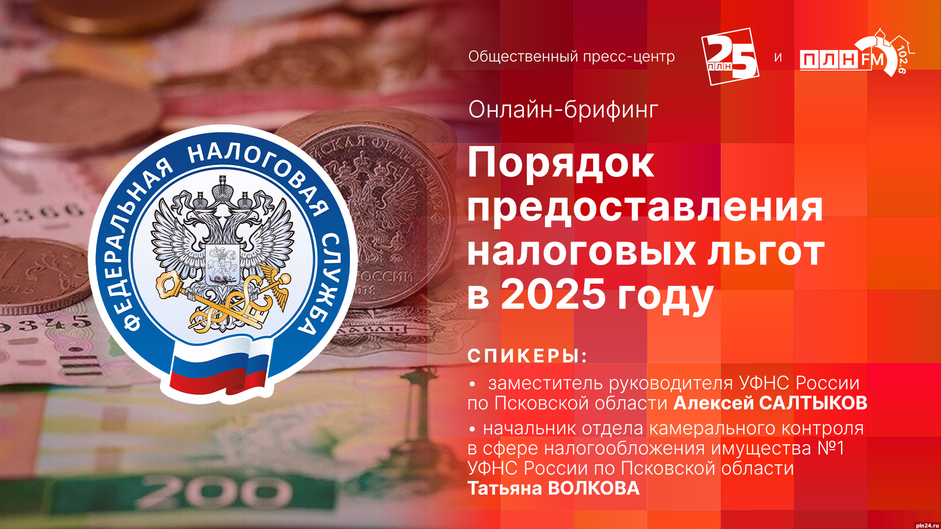 Предлагаем вашему вниманию видеотрансляцию онлайн-брифинга, который стартует на площадке объединенного пресс-центра Псковской Ленты Новостей и радиостанции «ПЛН FM». Его темой станет порядок предоставления налоговых льгот в 2025 году.