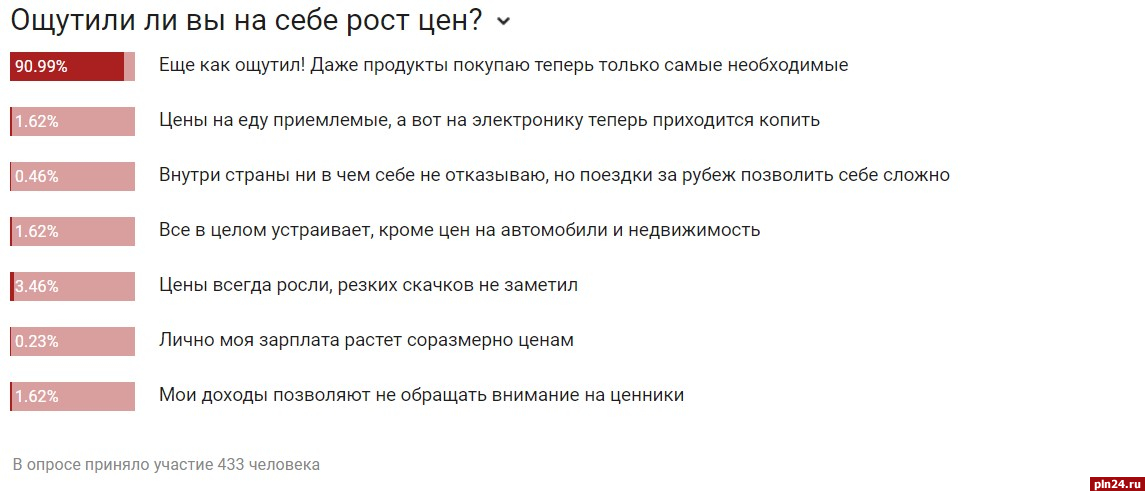 Большинство респондентов Псковской Ленты Новостей, а именно 90,99%, ощутили на себе рост цен.