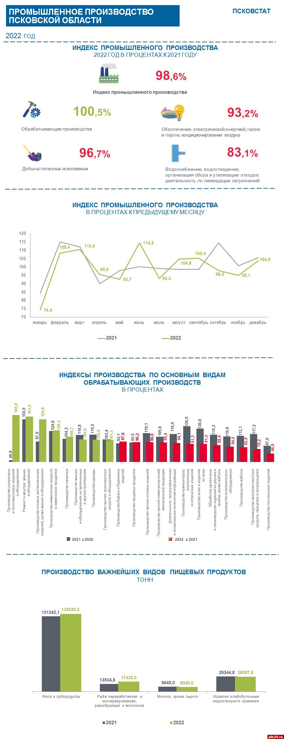 Промышленное производство Псковской области в 2022 году сократилось на 1,4% по сравнению с 2021 годом. Об этом Псковской Ленте Новостей сообщили в Псковстате.