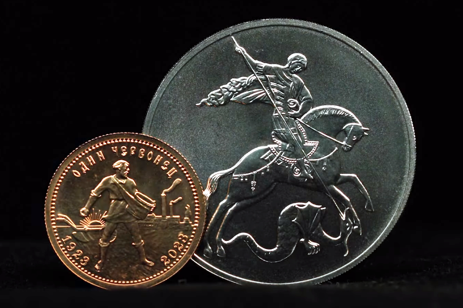 Банк России выпускает в обращение инвестиционные монеты: это серебряная монета «Георгий Победоносец» номиналом 3 рубля и золотая — «Золотой червонец» номиналом 10 рублей.