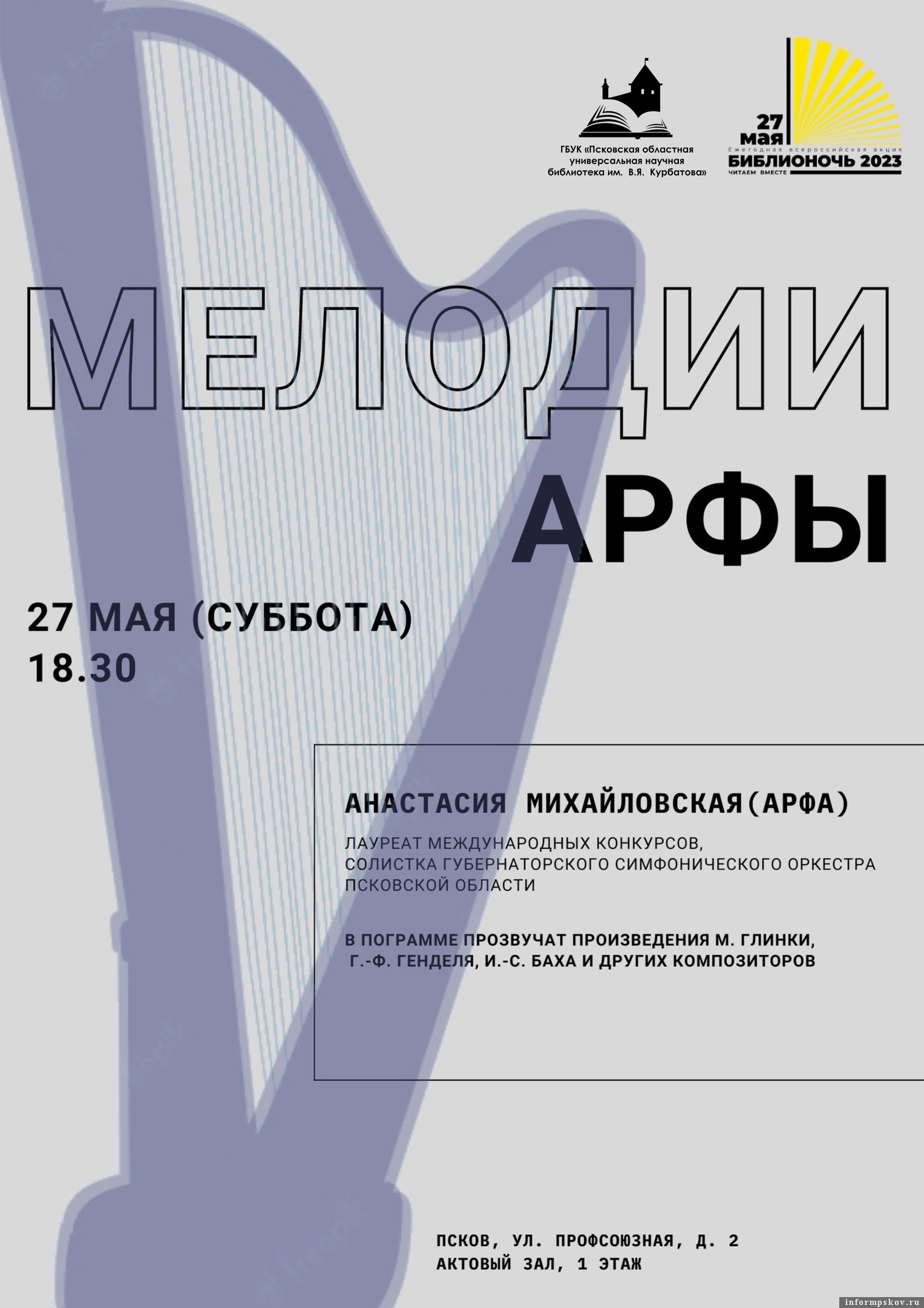 Псковская областная универсальная научная библиотека имени В. Я. Курбатова организует концерт арфовой музыки в рамках всероссийской акции «Библионочь» 27 мая.