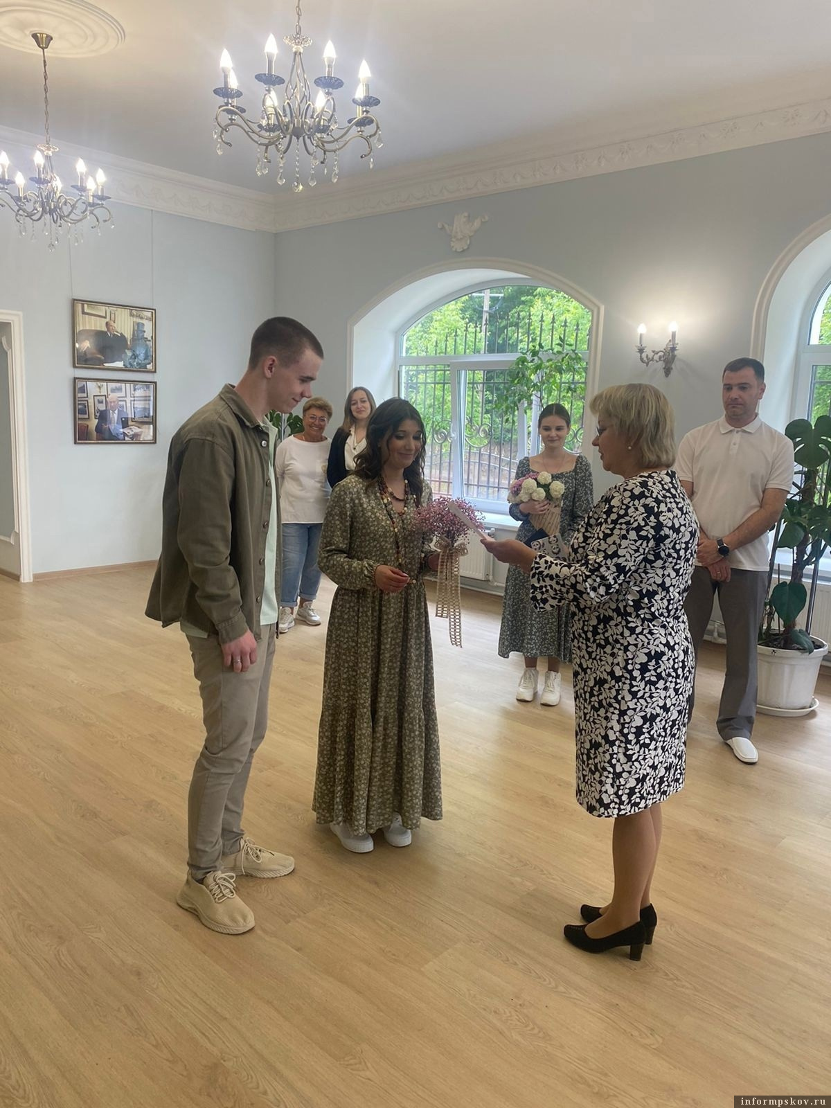 В первую субботу июня в музейных залах состоялась первая регистрация. Жених – уроженец Пушкинских Гор, невеста – из Рязани, и, как удалось узнать, она учитель начальных классов в средней школе имени А. С. Пушкина. Регистрация и свадьба после долгих раздумий и множества вариантов прошла в стиле бохо.