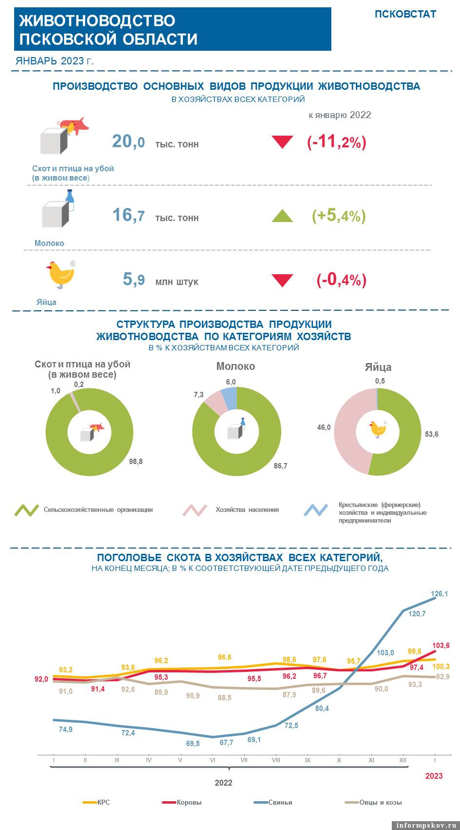 Численность основных видов скота в хозяйствах всех сельхозпроизводителей Псковской области на конец января 2023 года составила: крупного рогатого скота – 61,2 тысячи голов, в том числе коров – 31,4 тысячи, а также свиней – 1395,9 тысячи; овец и коз – 27,3 тысячи голов.