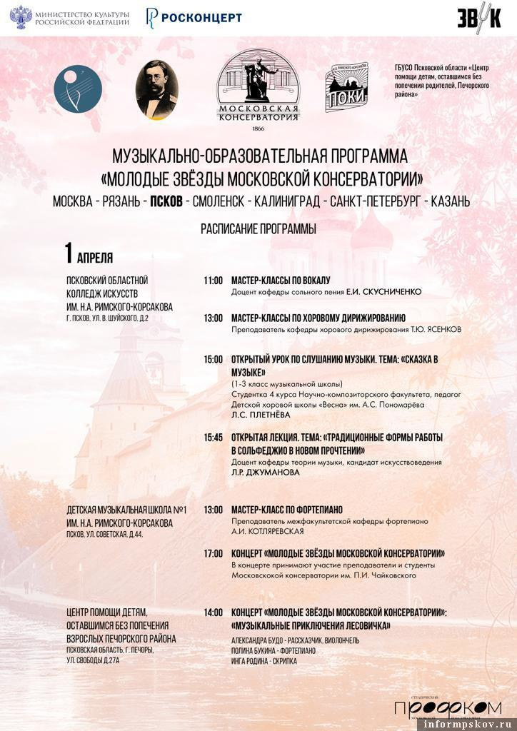 Серию мастер-классов и открытых уроков проведут преподаватели Московской государственной консерватории имени П. И. Чайковского в Пскове.
