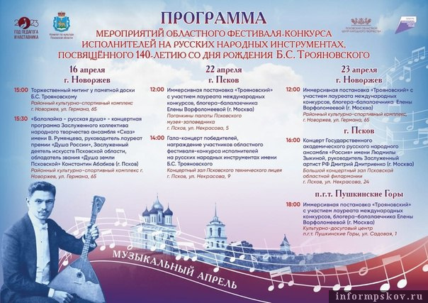 Афишу областного фестиваля-конкурса и мероприятий, посвящённых 140-летию со дня рождения русского музыканта, виртуоза-балалаечника Б. С. Трояновского, разместили на официальном сайте комитета по культуре Псковской области.
