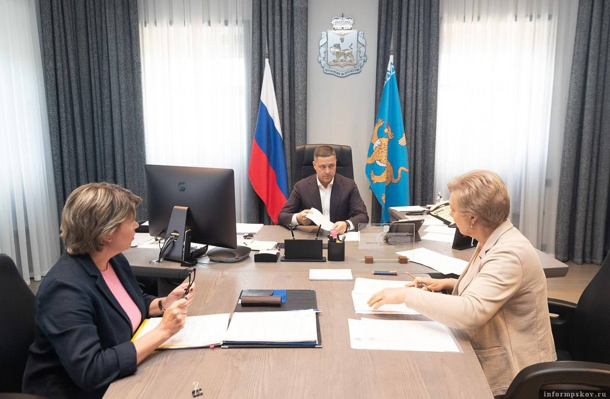 Губернатор Псковской области Михаил Ведерников с первым вице-губернатором Верой Емельяновой и председателем комитета по здравоохранению Мариной Гаращенко обсудили реализацию рекомендаций Минздрава по итогам визита в Пско