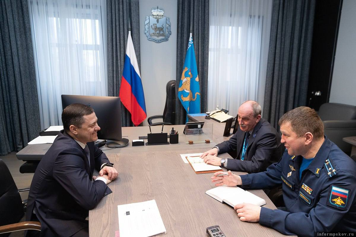Губернатор Псковской области провел встречу с директором международного аэропорта «Княгиня Ольга» Артемом Тарасовым и командиром военно-транспортного полка полковником Владимиром Кожемяко.