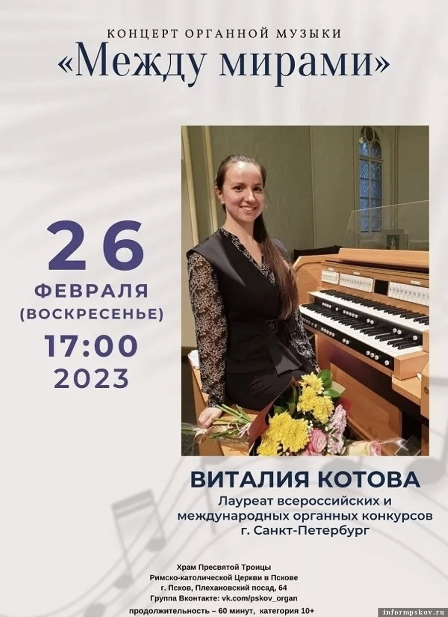 Концерт органной музыки из цикла «Между мирами» состоится в храме Пресвятой Троицы Римско-католической Церкви в Пскове 26 февраля в 17:00.