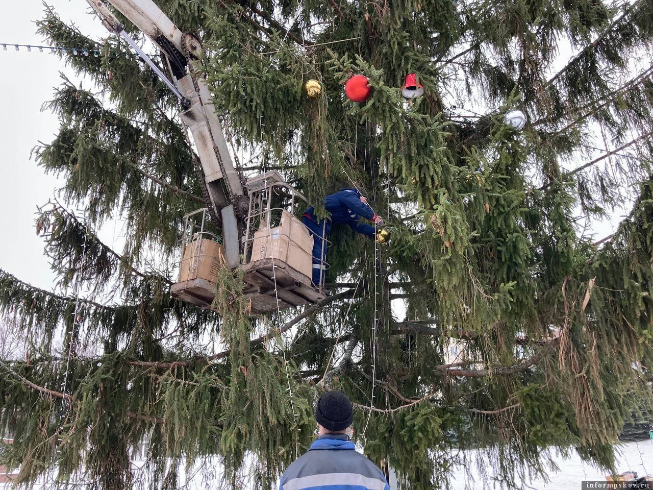 Демонтаж главной новогодней ели начался на площади Ленина в Великих Луках, сообщает газета «Великолукская правда.
