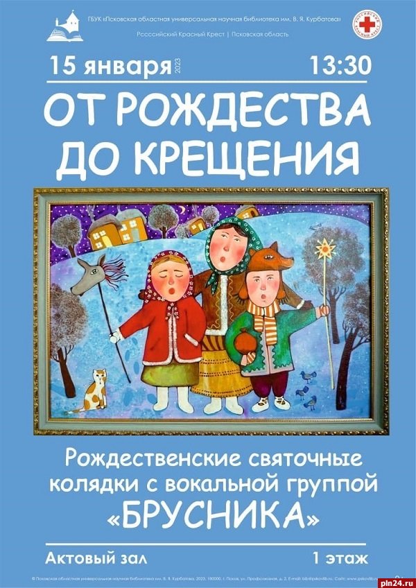 Рождественские святочные колядки исполнит вокальная группа «Брусника» в Псковской областной универсальной научной библиотеки имени В. Я. Курбатова 15 января.
