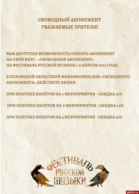 Свободный абонемент могут приобрести псковичи на мероприятия 49-го Фестиваля русской музыки, который пройдёт с 1 по 9 апреля.