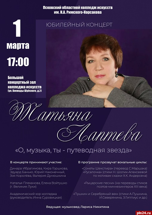 Юбилейный концерт заслуженного деятеля искусств Псковской области, члена Союза композиторов России, музыковеда, преподавателя Татьяны Лаптевой «О, музыка, ты – путеводная звезда» состоится в Псковском областном колледже искусств имени Н. А. Римского-Корсакова 1 марта. Об этом Псковской Ленте Новостей сообщили в образовательном учреждении.