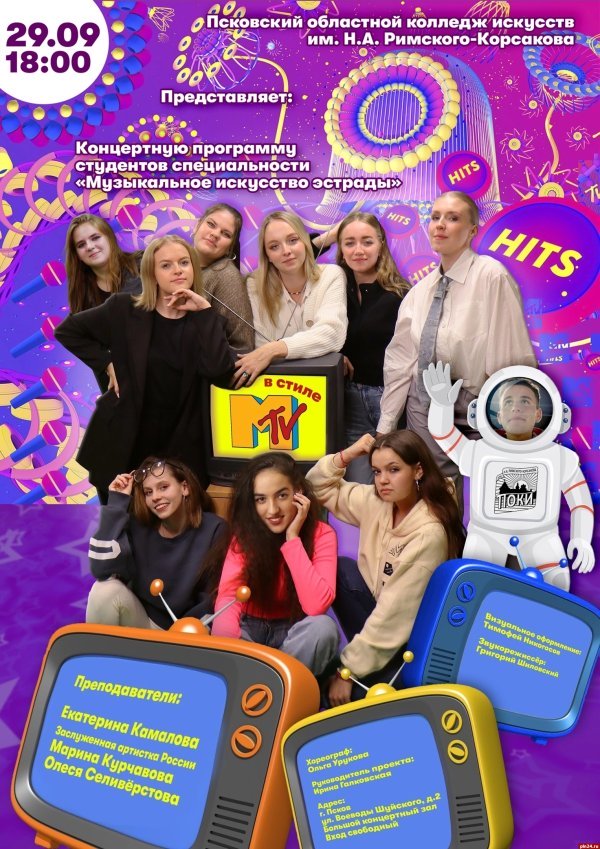 Эстрадный концерт «В стиле MTV» состоится в концертном зале Псковского областного колледжа искусств имени Н. А. Римского-Корсакова 29 сентября в 18:00.