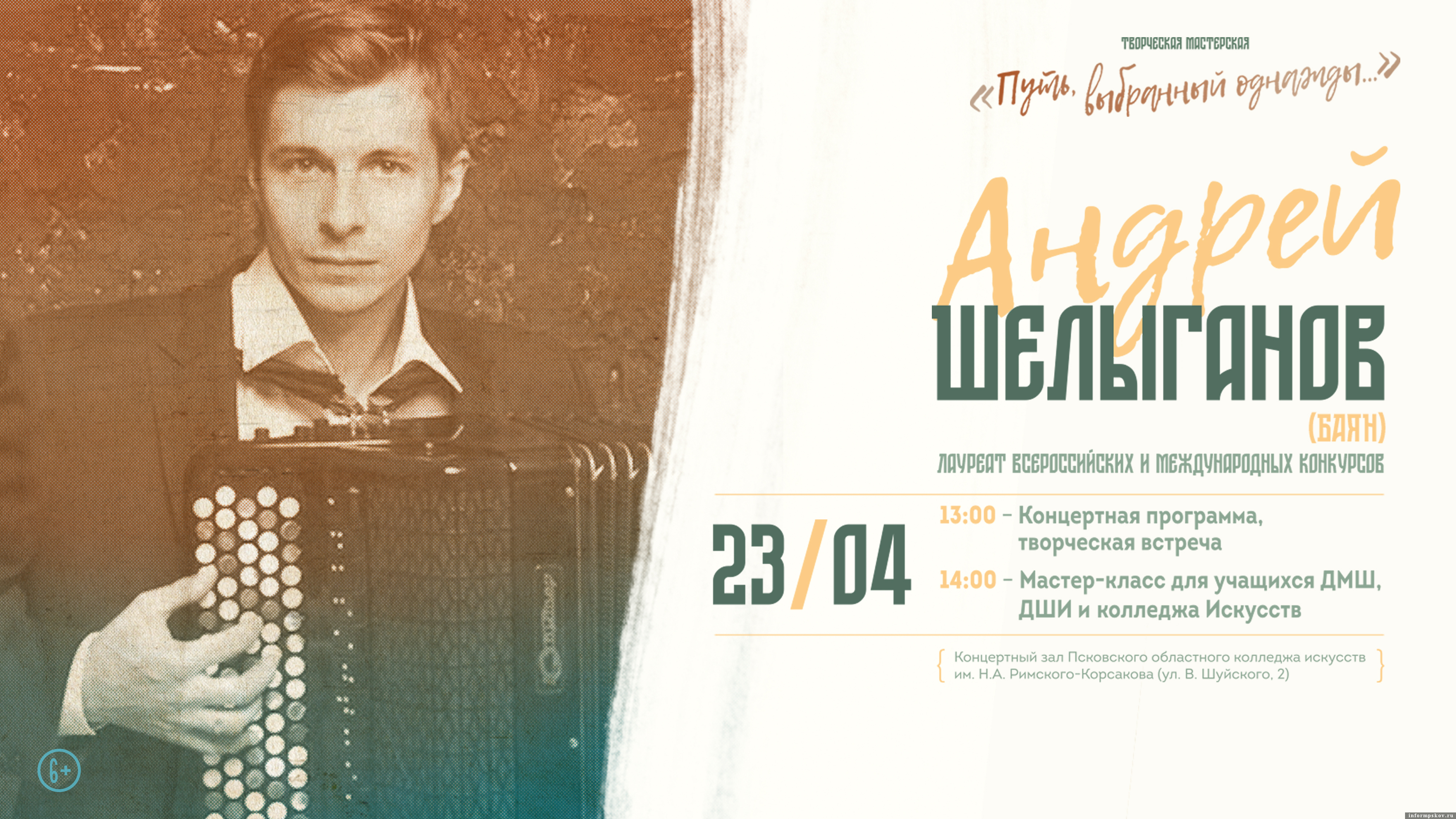 Мастер-класс и концерт баяниста Андрея Шелыганова пройдёт в рамках творческой мастерской «Путь, выбранный однажды…». Об этом ПАИ сообщили в пресс-службе Театрально-концертной дирекции Псковской области.