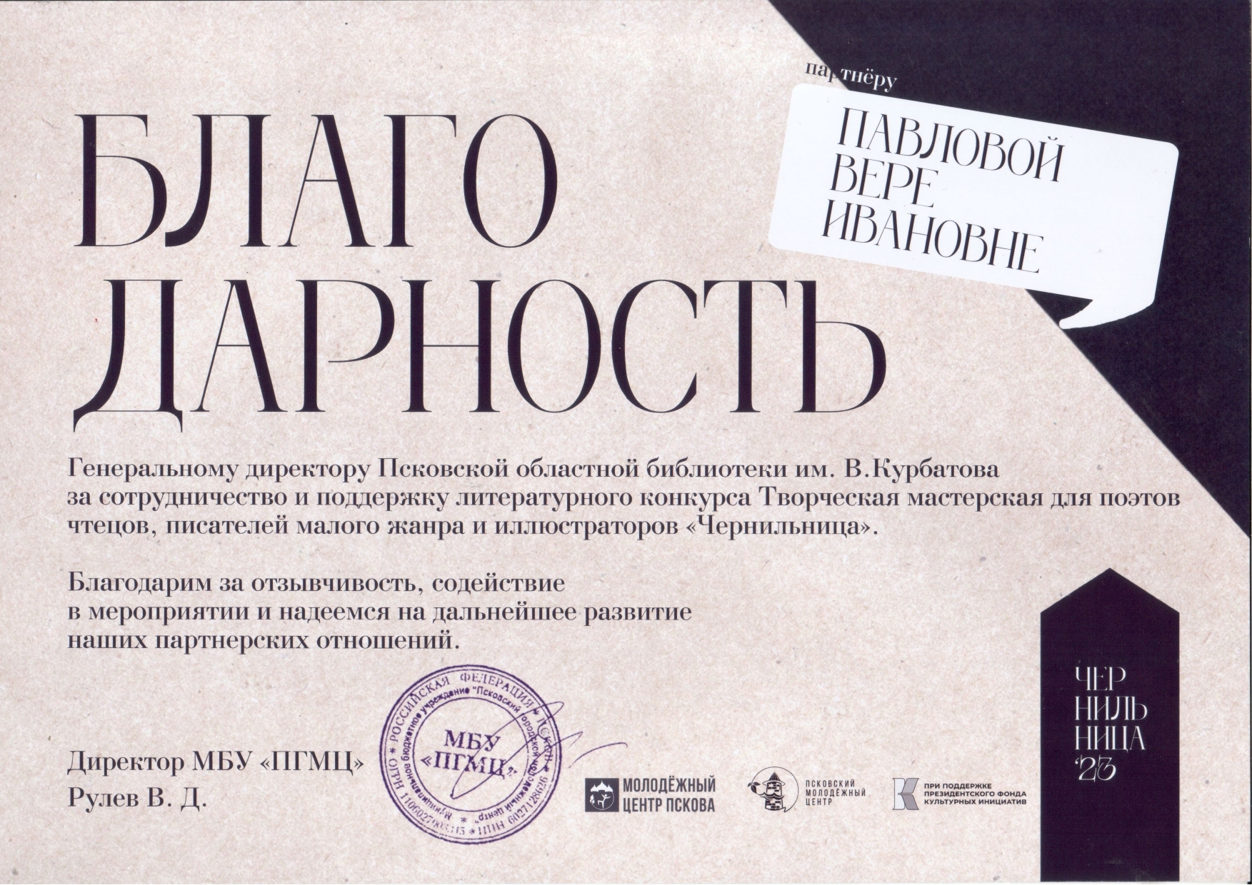 В адрес генерального директора библиотеки имени Курбатова Веры Ивановна Павловой поступила благодарность от директора Псковского городского молодежного центра Виктора Рулева.