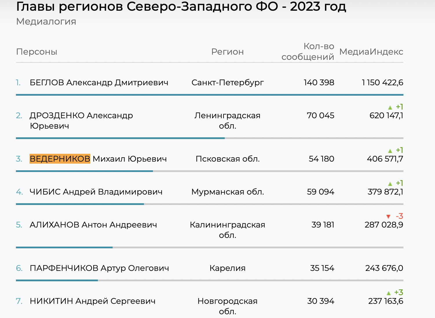 Губернатор Псковской области Михаил Ведерников занял третью позицию в медиарейтинге глав регионов СЗФО по итогам 2023 года по данным сервиса «Медиалогия».