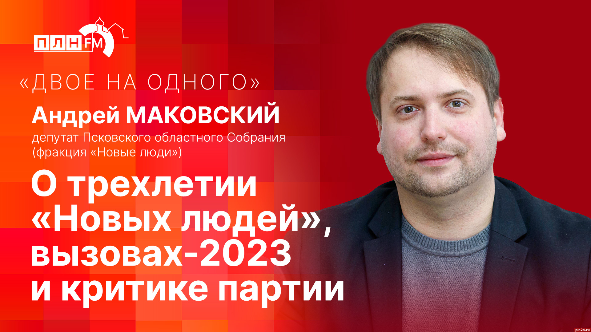 Ведущие Александр Савенко и Константин Калиниченко поговорят с ним о трехлетии партии и вызовах этого года. Чем «Новые люди» отличаются от неновых людей из других партий? Что происходит в региональном отделении партии? Реально ли вернуться к однопартийной системе в России? Готовы ли «Новые люди» стать частью некой объединенной партии власти? В чем Андрей Маковский видит главные вызовы 2023 года и как относится к критике в свой адрес и в адрес партии? И, наконец, кто от «Новых людей» пойдет на губернаторские выборы в Псковской области?