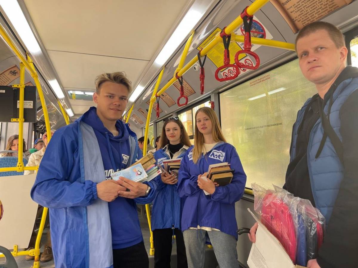 На улицах Пскова и в общественном транспорте члены партии, активистки «Женского движения Единой России», молодогвардейцы,