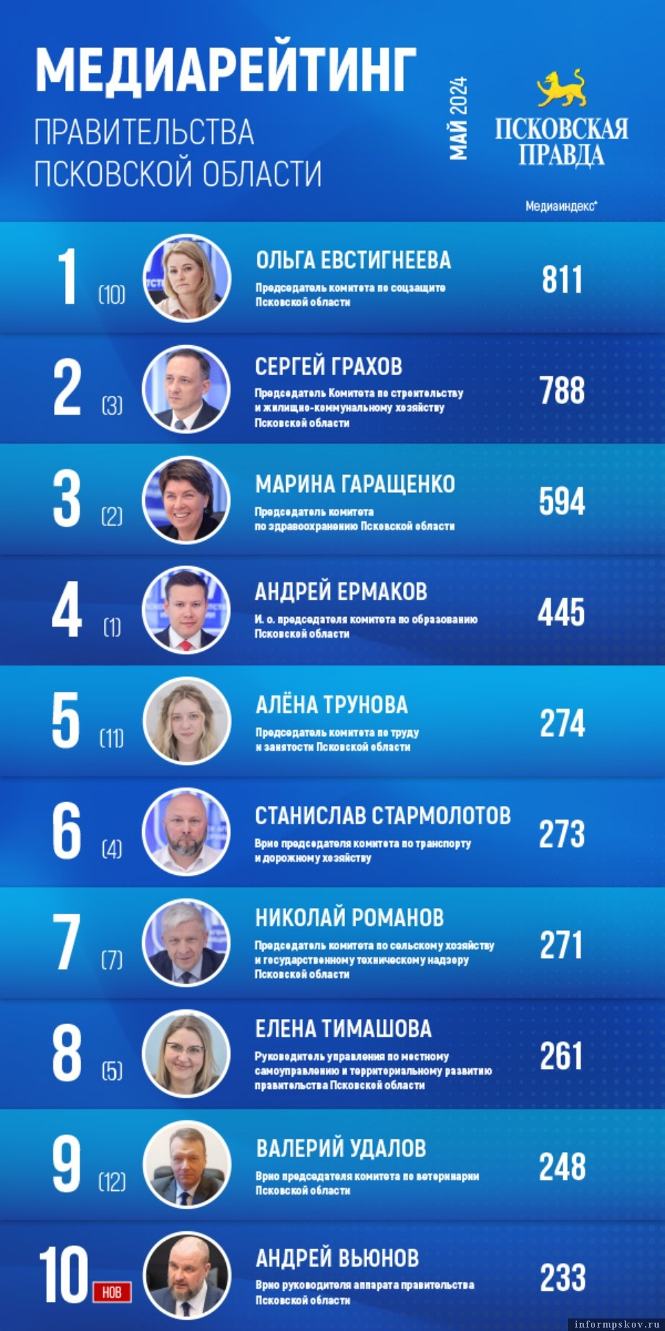 Кроме того, на шесть строчек в медиарейтинге исполнительной власти региона поднялась председатель комитета по труду и занятости Псковской области Алёна Трунова (пятое место с медиаиндексом 274). Она принимала участие в мероприятиях, приуроченных ко Дню Весны и Труда.