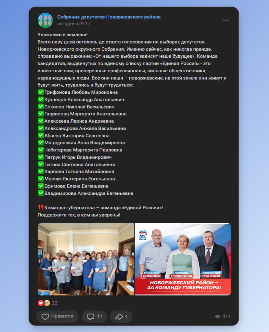 5 сентября в группе ВКонтакте районного Собрания депутатов Новоржевского района были опубликованы 2 поста, призывающих голосовать за «Единую Россию» на выборах.