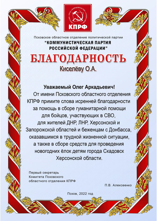 Сегодня вручены памятные медали ЦК КПРФ "100 лет образования СССР" Воробьеву Виктору Илларионовичу (ППО №3 г.Псков) и Михайлову Виктору Андреевичу недавно отпраздновавшему юбилей 90 лет (ППО №6 г.Псков), благодарность обкома Киселеву Олегу Аркадьевичу (ППО №2 г.Псков) за помощь в сборе гуманитарной помощи.