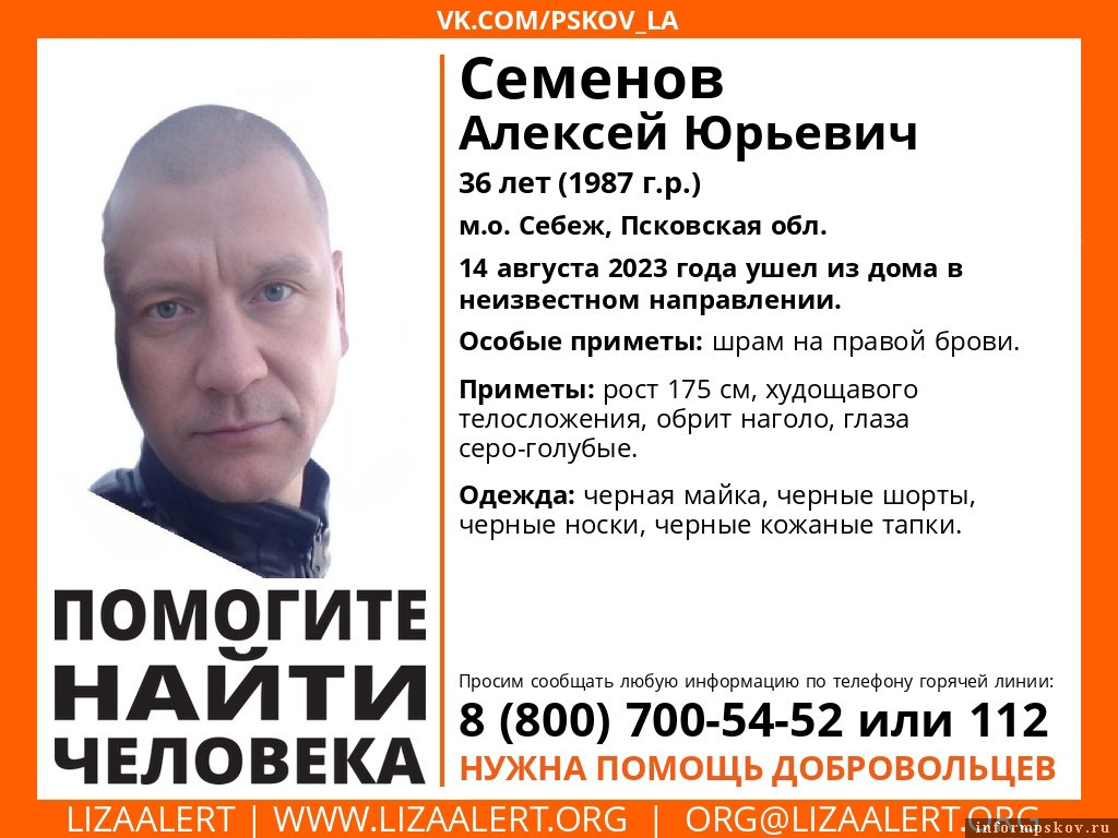 36-летнего Алексея Семенова разыскивают в Псковской области, сообщили в поисковом отряде «Лиза Алерт».