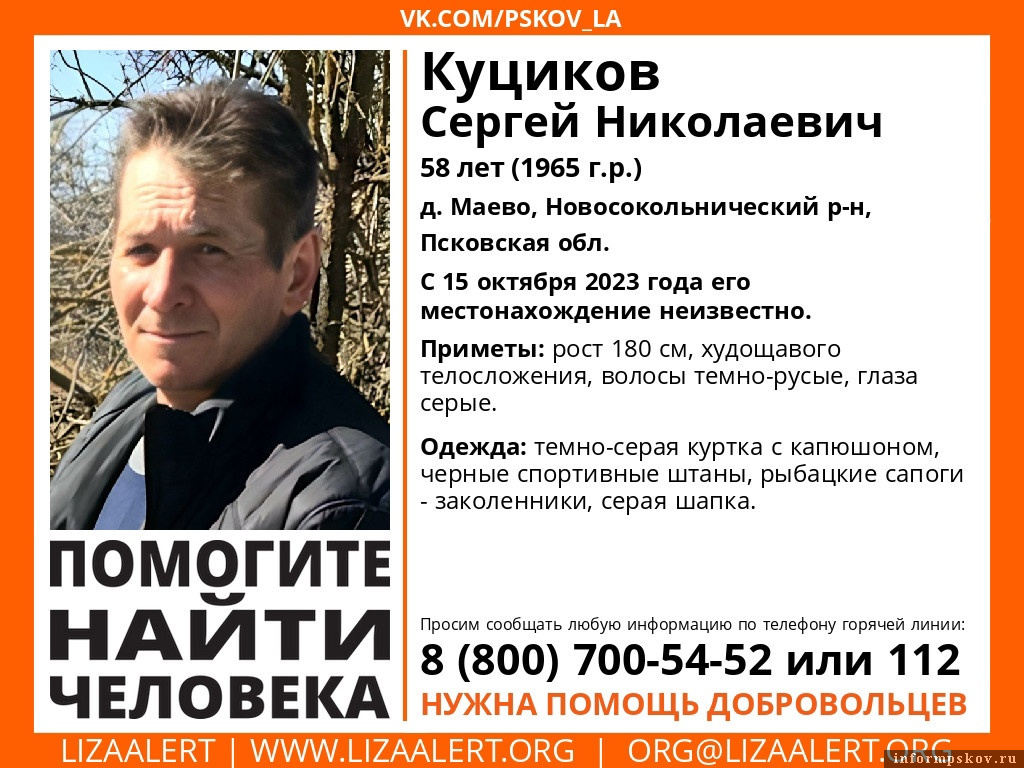 58-летний Сергей Куциков пропал в деревне Маево Новосокольнического района, сообщается в группе поискового отряда «ЛизаАлерт» Псковской области в социальной сети «ВКонтакте».