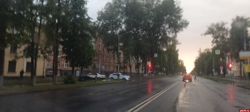 Дорожный знак сбил автомобиль на Октябрьском проспекте в Пскове. Снимок 4 июля опубликован в группе «Жесть по-псковски» в социальной сети «ВКонтакте».