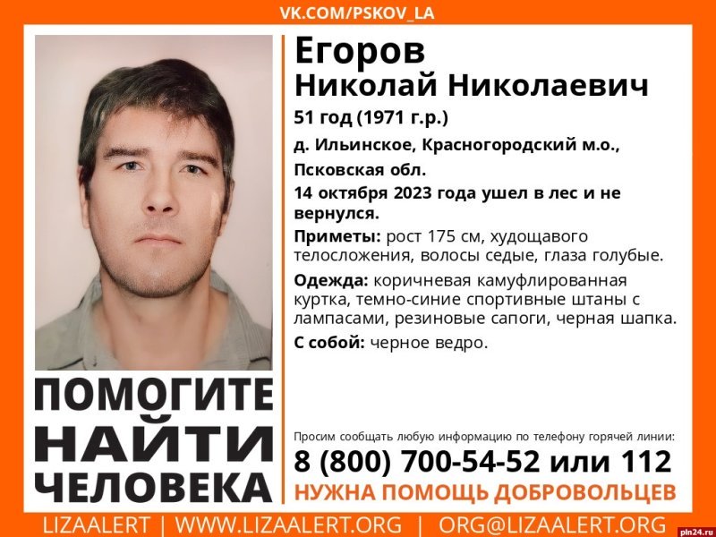 51-летний Николай Егоров пропал в деревне Ильинское Красногородского района.