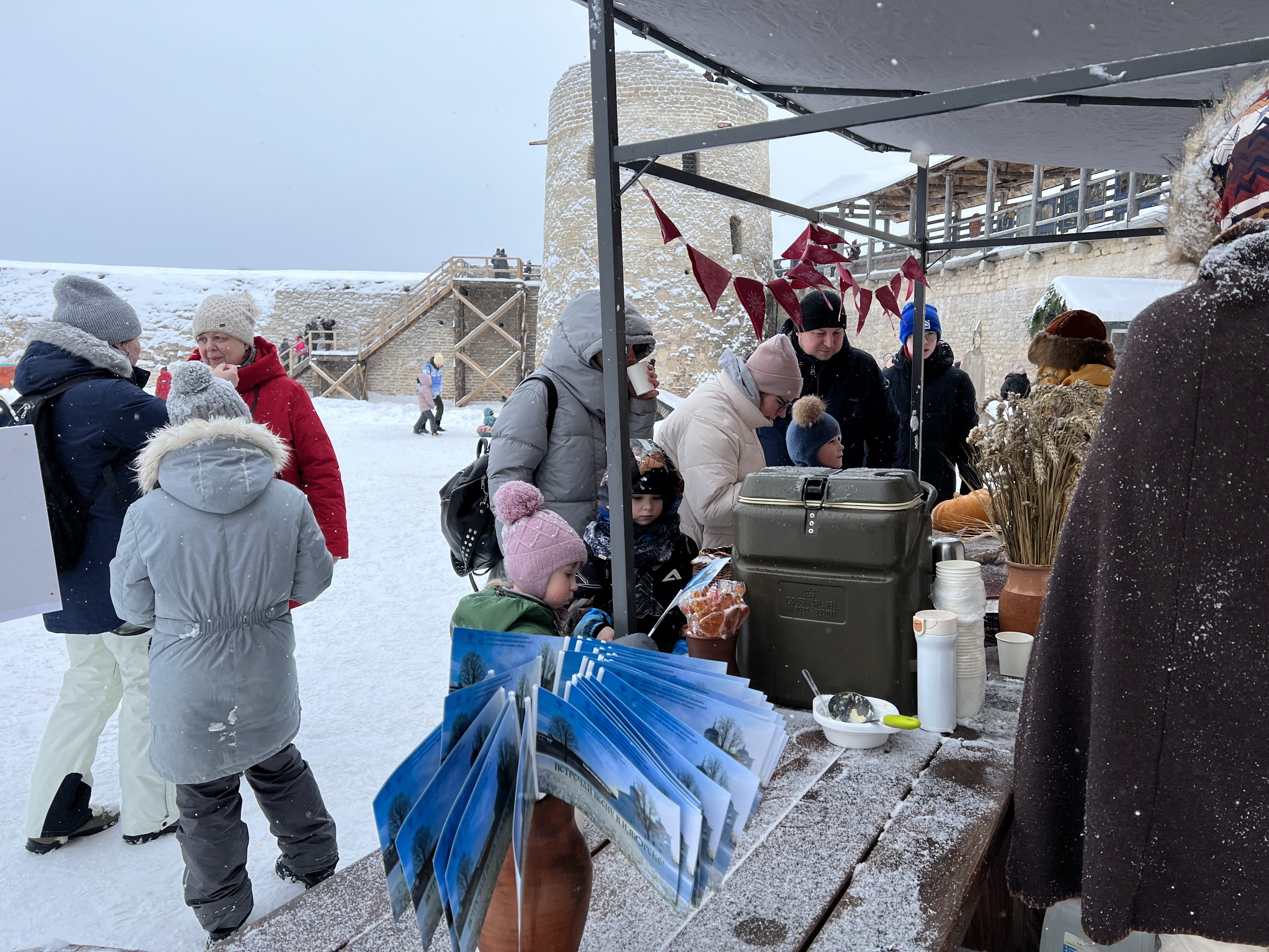После культурной программы все желающие смогли отведать знаменитых изборских блинов с душистым чаем, узнать особенности средневековой кухни, попробовав пшеную кашу с тыквой, поиграть в весёлые игры в Изборской крепости и сделать интересные фотографии в музейном фотоателье.