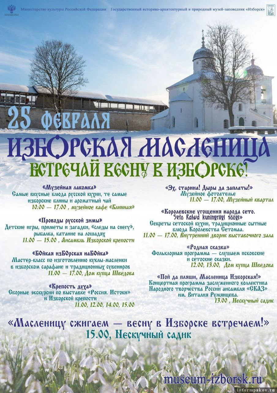 Празднование начнётся в 11:00, а закончатся около пяти часов вечера. За это время вы сможете полакомиться изборскими блинами, поиграть в весёлые игры в Изборской крепости, послушать родные сказки – русские и сетоские, посетить музейные экспозиции и многое другое. Конечно же в этот день гости окончательно попрощаются с зимой и сожгут чучело Масленицы.