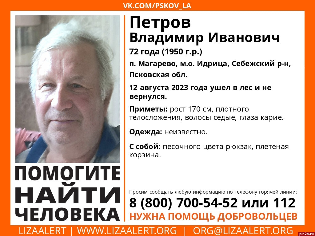 72-летний Владимир Петров пропал в поселке Магарево Себежского района. 12 августа мужчина ушел в лес и не вернулся. Об этом сообщается в группе регионального отделения поискового отряда «ЛизаАлерт» в социальной сети «ВКонтакте».