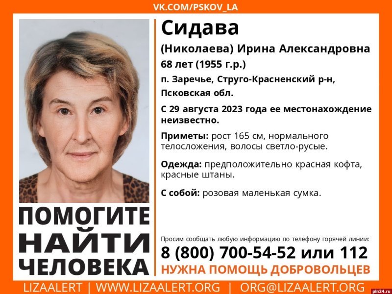 68-летняя Ирина Сидава (Николаева) пропала в стругокрасненской деревне Заречье, сообщили Псковской Ленте Новостей в региональном отделении поискового отряда «ЛизаАлерт».