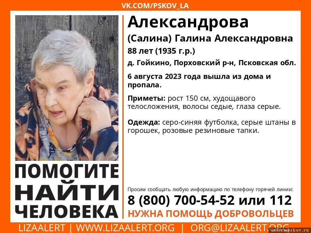 88-летнюю пенсионерку Галину Александрову (Салину), жительницу деревни Гойкино Порховского района ищут в Псковской области.
