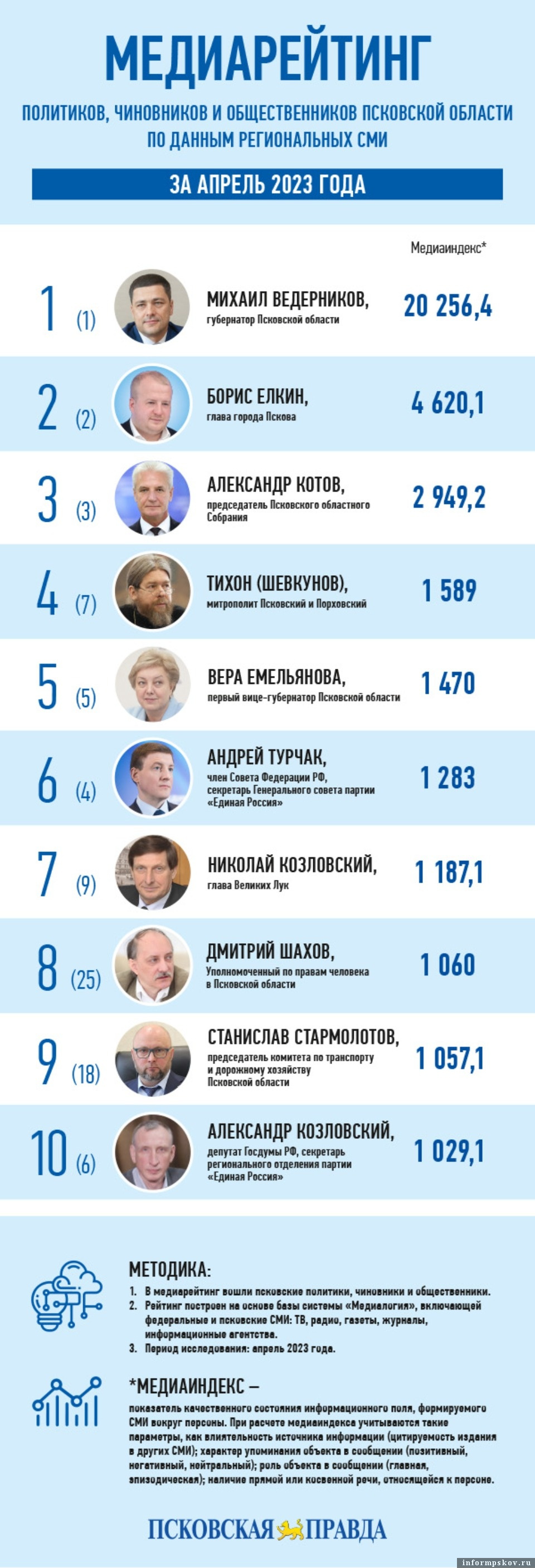 Значительный рост в региональном медиарейтинге газеты «Псковская правда» продемонстрировал уполномоченный по правам человека в Псковской области Дмитрий Шахов — на 17 пунктов, сразу в первую десятку топ-30 (8-е место, медиаиндекс 1 060). Медиарейтинг был составлен по данным системы «Медиалогия» за апрель.