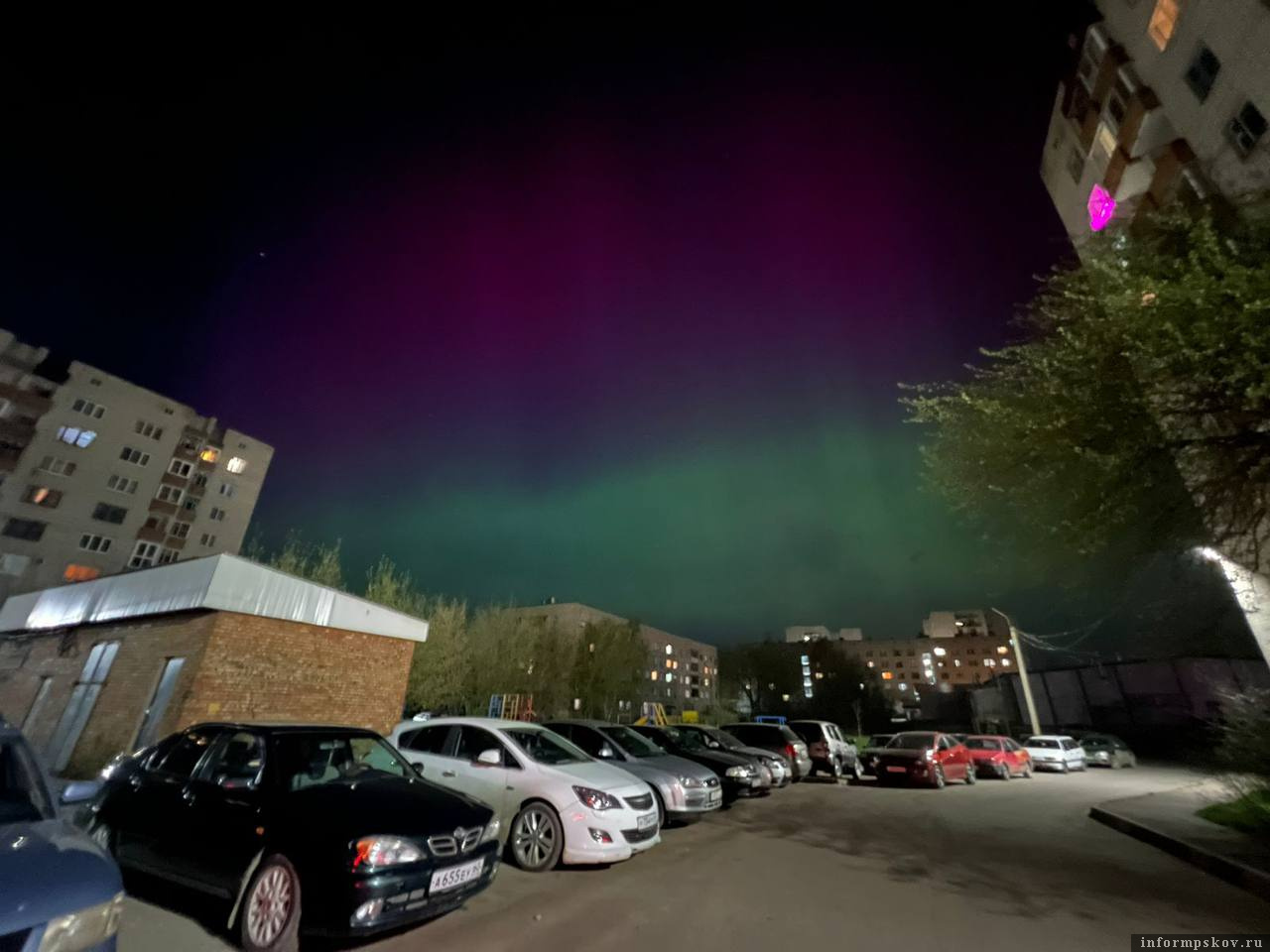 Северное сияние было замечено на Октябрьском проспекте в Великих Луках, сообщает телеграм-канал «Luki-news».