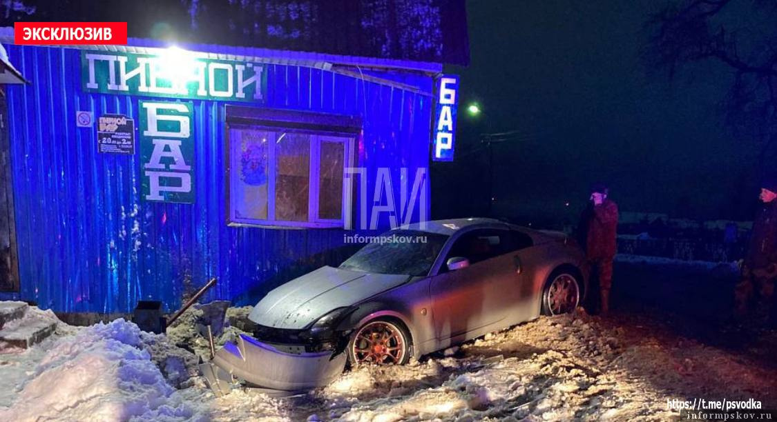 В Невеле на Гвардейской улице водитель, управляя автомобилем Nissan 350Z, не справился с управлением и влетел в бар.
