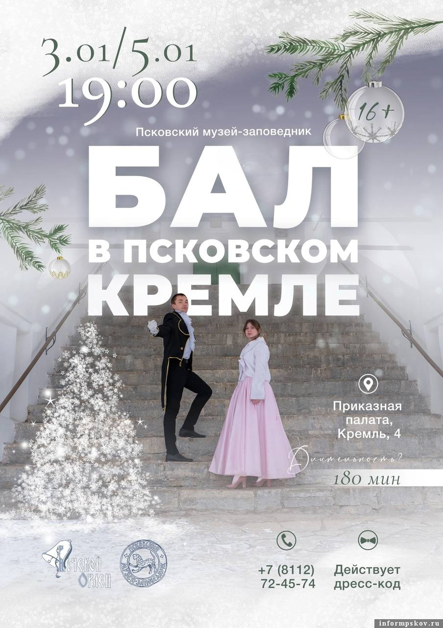 Новогодний бал состоится в Псковском кремле 2 января, об этом сообщается в Telegram-канале Псковского музея-заповедника.