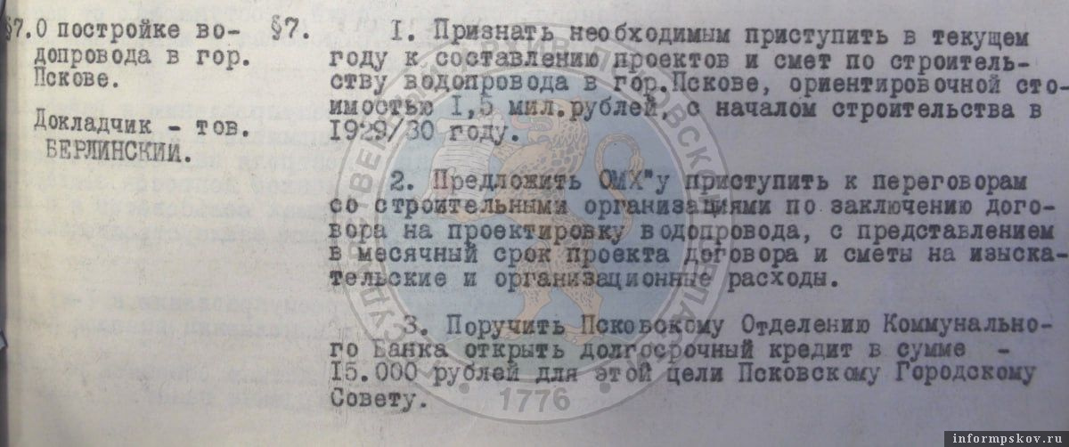«Признать необходимым приступить в текущем году к составлению проектов и смет по строительству водопровода в Пскове, ориентировочной стоимостью 1,5 млн рублей», - сообщалось в протоколе заседания президиума Псковского окрисполкома от 30 марта 1929 года.