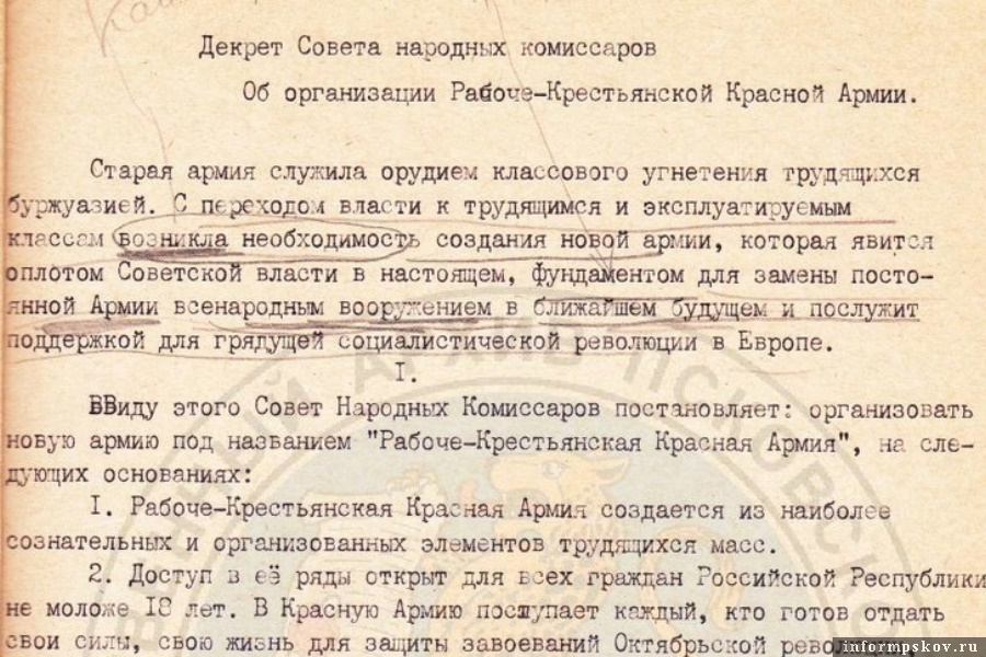 23 февраля считается днем рождения Рабоче-Крестьянской Красной Армии. Эта страница истории создавалась в 1918 году на псковской земле, рассказали в Псковском государственном архиве.