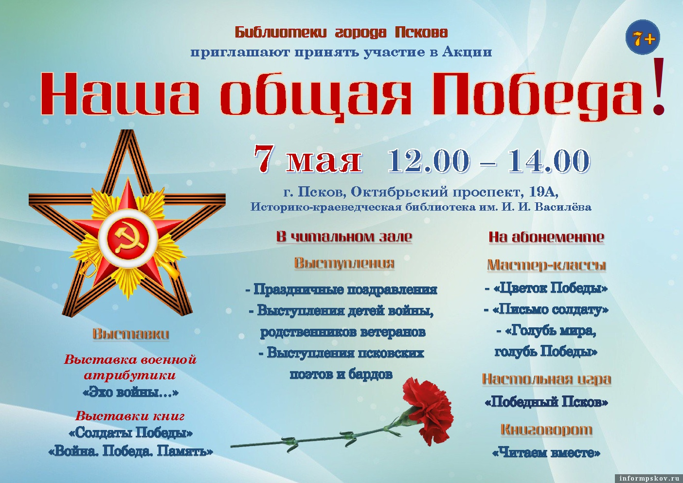 В библиотеке отметили, что пройдут мастер-классы — «Письмо солдату» по изготовлению фронтовых почтовых треугольников, «Голубь мира, голубь Победы!» по изготовлению бумажных голубей и «Цветок Победы» по изготовлению бумажных цветов. А для детей будет организована настольная игра «Победный Псков».