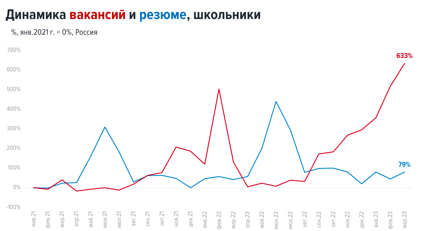 Исследование показало, что по сравнению с показателями начала 2021 года на рынке труда растёт спрос на самых юных работников, а именно школьников. Так, по сравнению с началом 2021 года число вакансий для школьников в целом по стране выросло в 6 раз. При это резюме молодежи до 18 лет также активно пополняют базу резюме сервиса HeadHunter: Прирост новых резюме от молодых соискателей составил плюс 79% по сравнению с показателями двухгодичной давности.
