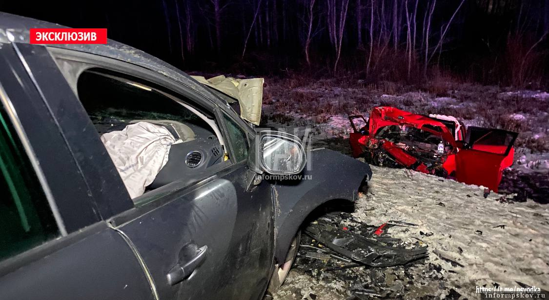 В Псковском районе на 21-м километре трассы А-212 произошло лобовое столкновение автомобилей Kia Soul и Peugeot 3008, после чего Kia Soul вылетел в кювет.