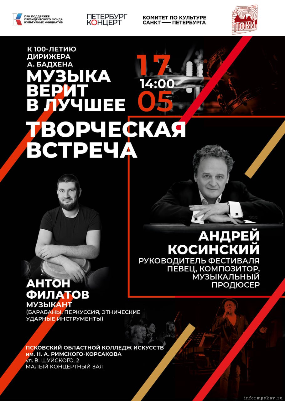 Творческая встреча с перкуссионистом Антоном Филатовым и композитором и исполнителем, музыкальным продюсером, лауреатом фестивалей «Песня года» и «Золотой граммофон» Андреем Косинским состоится 17 мая в малом зале Псковского областного колледжа искусств имени Н. А. Римского-Корсакова. Об этом ПАИ сообщили организаторы мероприятия.