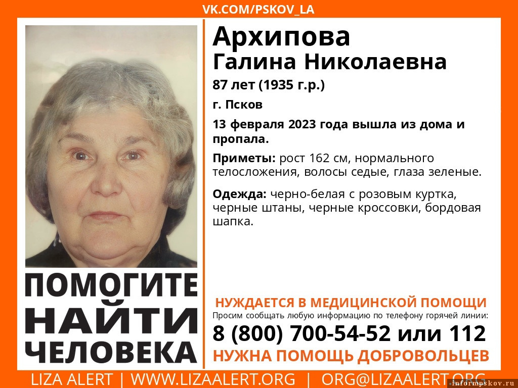 В Пскове разыскивают 87-летнюю Архипову Галину Николаевну. По сообщению координаторов региональной поисковой организации LizaAlert, женщина 13 февраля 2023 года вышла из дома и пропала.